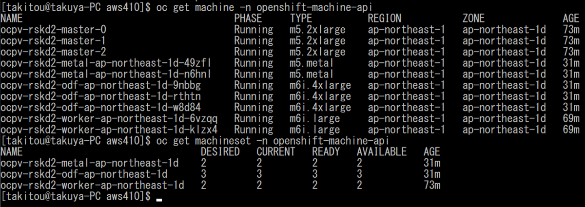 oc get machineset -n openshift-machine-apiNAME DESIRED CURRENT READY AVAILABLE AGEocpv-rskd2-worker-ap-northeast-1d 2 2 2 2 34moc get machineset -n openshift-machine-api ocpv-rskd2-worker-ap-northeast-1d -o yaml > ocpv-odf-apne-1d.yaml