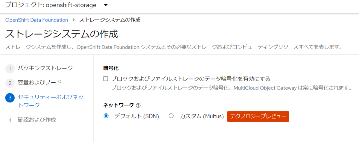 次にODFのカスタムリソースであるStorage Systemを作成し、ストレージクラスタを構成します。