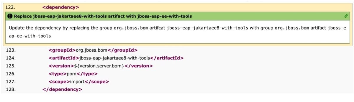 この分析の結果は、私たちの予想と一致しています (つまり、"javax"への参照を"jakarta"に変更)。他のいくつかの変更点も強調表示されています (たとえば、アプリケーションは Java Server Faces を使用しています)。そのため、JBoss EAP 8-Beta バージョンと一致するようにバージョンを更新する必要があります。