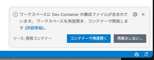 - 右下に表示されるダイアログボックスからコンテナーで再度開くを選択する