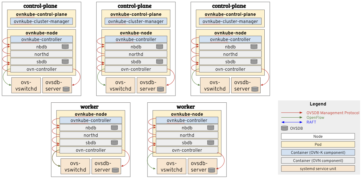 OVNK Legacyでは、OpenShift/Kubernetesクラスター1つに対してOVNクラスターを1つデプロイしていましたが、OVNK Interconnectでは、各ノードごとに1つのOVNスタックを配置します。具体的には、OVNのコントロールプレーンとなるnbdb, sbdb, northdといったコンテナが、control planeノードではなく、全ノード上の ovnkube-node