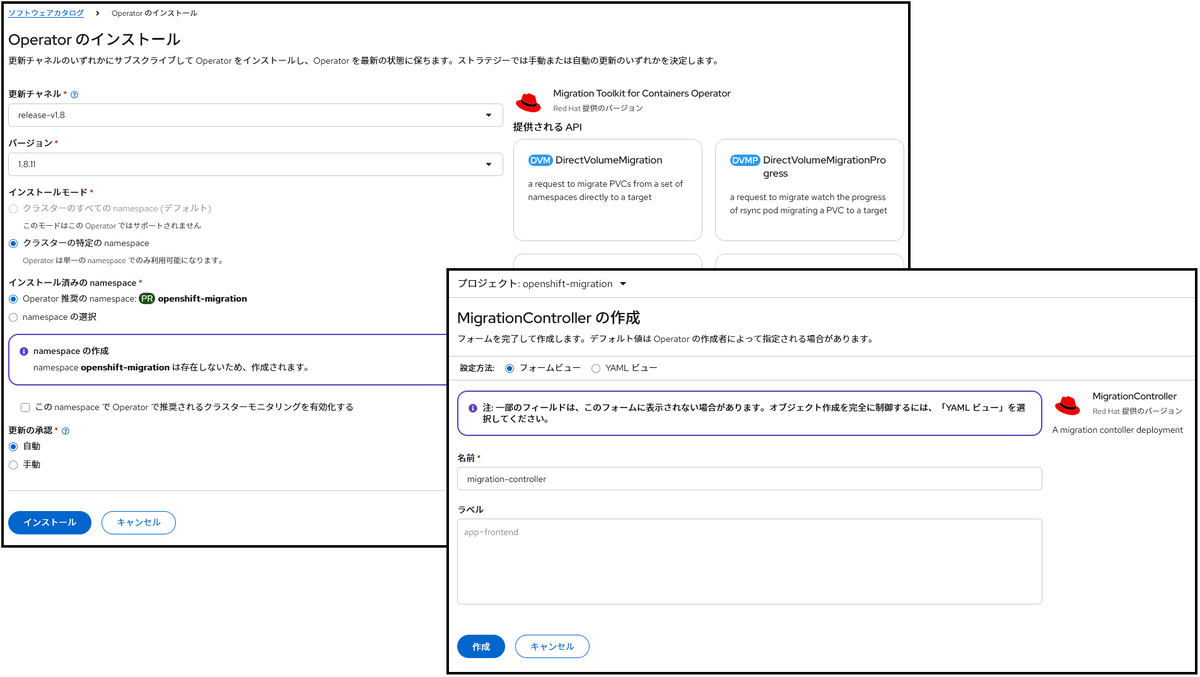 まず MTC のセットアップをします。MTC Operator をデフォルトの openshift-migration namespace にインストールし、MigrationController カスタムリソースを作成します。