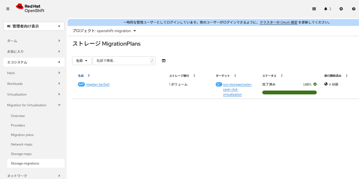 ストレージの移行は、左メニューの "Migration for Virtualization" の下にある、"Storage migrations" から状況を見ることができます。